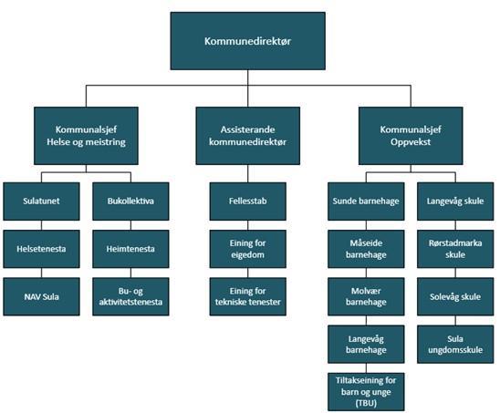 Administrativ organiseringLytt til tekstenStopp avspillingHer finn du informasjon om korleis Sula kommune er organisert.OrganisasjonskartOrganisasjonskart for Sula kommune, gjeldande frå 01.01.26 Sula kommune Digitalt organisasjonskartUnder finn du ein digital versjon av organisasjonskartet til Sula kommune, kartet utvidar seg når du trykker på boksane. Bruk rullefelt (scrollbar) under figur for å se hele innholdet.Bente Glomset VikhagenkommunedirektørJarl Anders Moe (konstituert)Kommunalområde helse og meistringkommunalsjef helse og meistringGrethe Juul MolværSulatuneteiningsleiarGrethe Elise Gjørvad ØenHelseavdelingaeiningsleiarHenrik OmenåsNAV SulaeiningsleiarCecilie ØrjaseterBukollektivaeiningsleiarTorunn VeddengHeimetenestaeiningsleiarCamilla VeeButenesteneeiningsleiarJarl Anders Moerådgivar helse og meistringRagnhild Hanken SkjongKommunalområde oppvekstkommunalsjef oppvekstLindis Karin Melseth AkslenTiltakseining for barn og unge (TBU)einingsleiarSusanne GresdalBarnevernfagleiarBerit Nesseth OtterleiHelsestasjonfagleiarSynnøve Molvær VågnesPedagogisk psykologisk teneste (PPT)fagleiarSkularOle Martin TonheimLangevåg skulerektorPål Andre HolenSula ungdomsskulerektorJanne Lise Dragsund LundbøRørstadmarka skulerektorBørre Andreas HagenSolevåg skulerektorBarnehagarAnita Beth Quon EikremSunde barnehagestyrarAnnette Korsnes AndersenMåseide barnehagestyrarAnne Kari Sandvik VadsetMolvær barnehagestyrarHanne Lise Dybvik SundeLangevåg barnehagestyrarPål Sindre Digernesrådgivar skuleBritt Klepperådgivar barnehageKjetil Lunde IngvaldsenSula kulturskulerektorTone FiskerstrandDonken fritidsklubbSunniva Marøy EriksenAssisterande kommunedirektørTerje HavnegjerdeEining for tekniske tenestereiningsleiarJohn Magne EikremEining for eigedomsforvaltningeiningsleiarFellesstab Publisert av Kathrin Vågnes Publisert 21.05.2024 13.46 Sist endra 06.01.2026 10.17